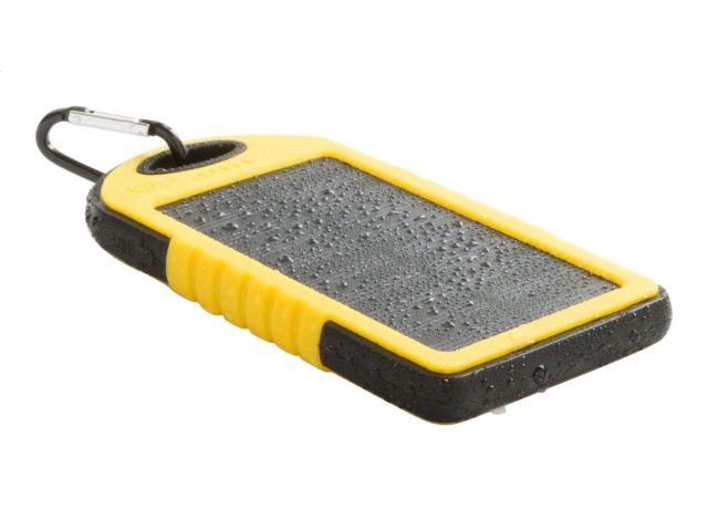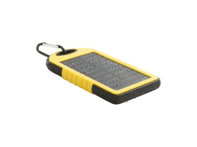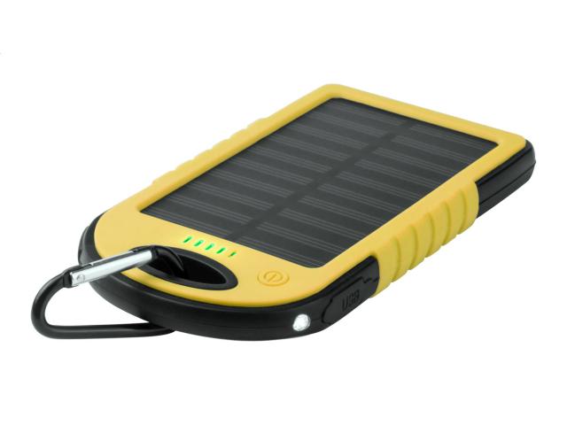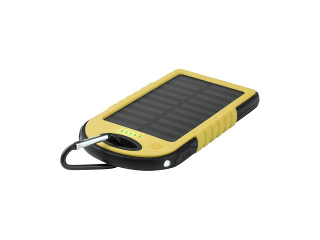 Silicone covered plastic power bank with 4000 mAh battery, solar charger and 1 LED flashlight. Including micro USB charger cable.