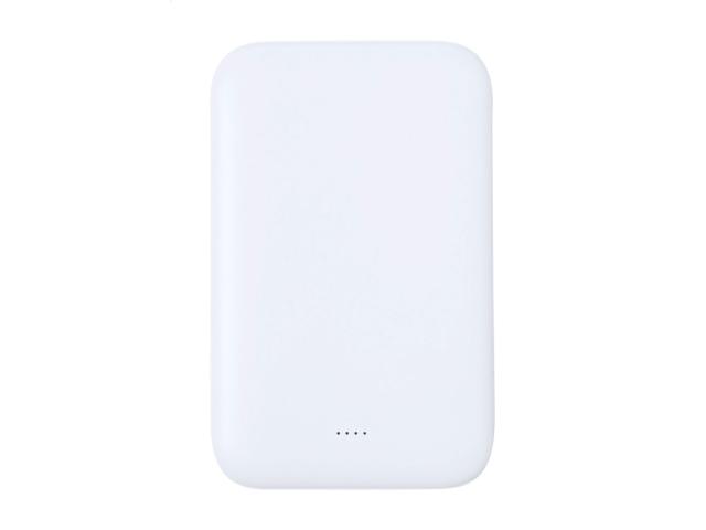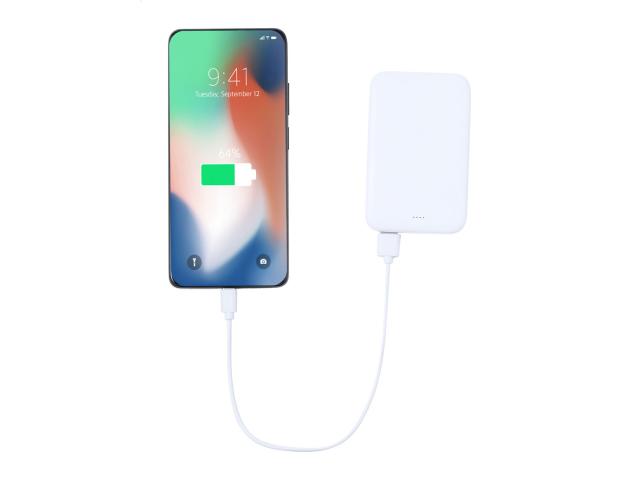 Recycled ABS plastic power bank with 5000 mAh battery. With 2 USB and 1 USB-C charger ports. USB-C input port. Including USB charger cable.