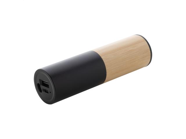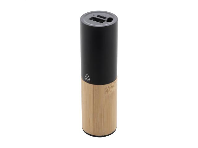 Recycled aluminium and bamboo power bank with 2600 mAh battery. With 1 USB and 1 USB-C charger ports. USB-C input port. Including USB charger cable.
