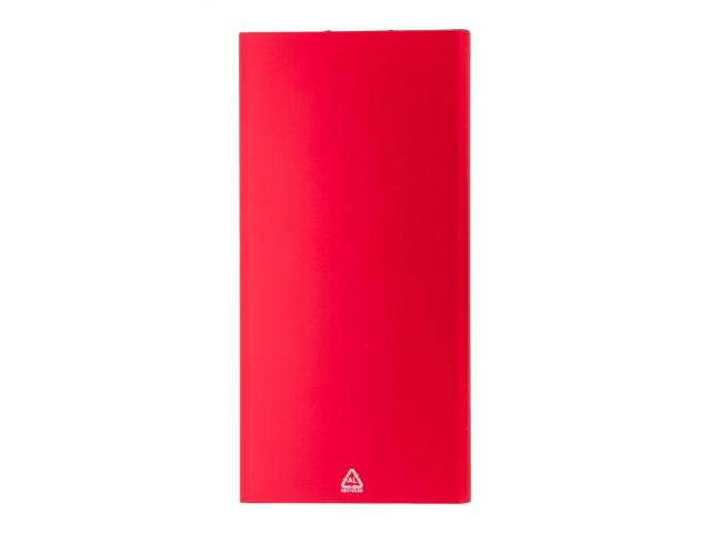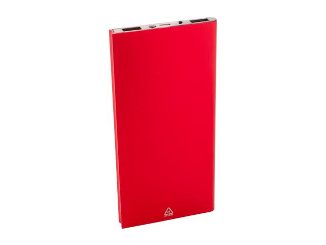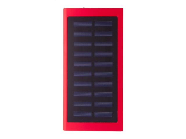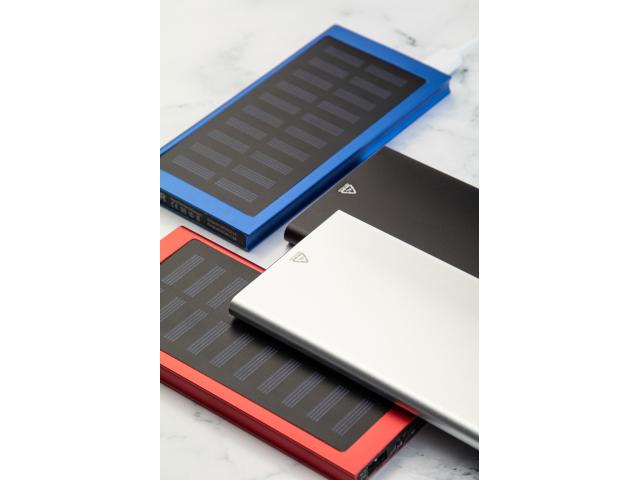 USB power bank in recycled aluminium housing with built-in solar charger and 4000 mAh battery. With 2 USB and 1 USB-C charger ports. USB-C input port. Including USB charger cable.