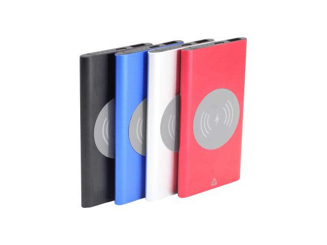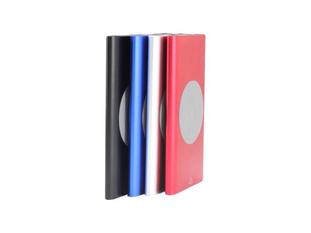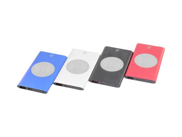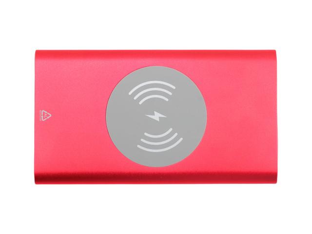 Recycled aluminium USB power bank with built-in wireless fast charger (15W) and 4000 mAh battery. With 1 USB and 1 USB-C charger ports. USB-C input port. Including USB charger cable.