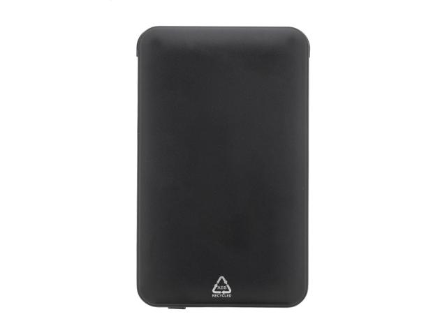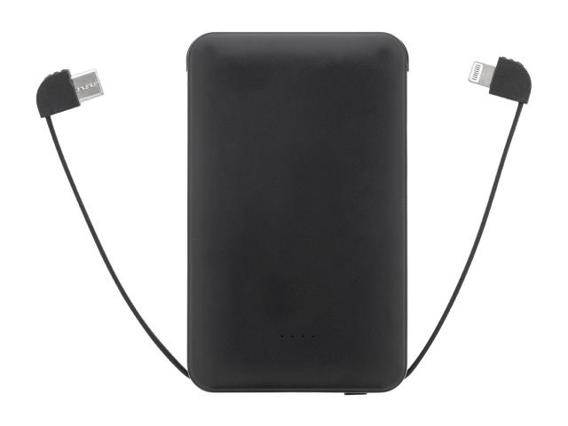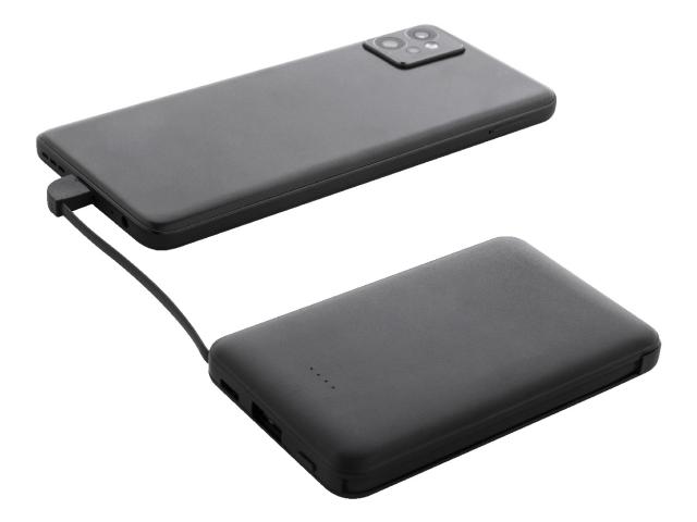 Recycled ABS power bank with 5000 mAh battery and integrated charger cables with micro USB, USB-C and Lightning connectors. With USB charger port and USB-C input port. Including USB charger cable.