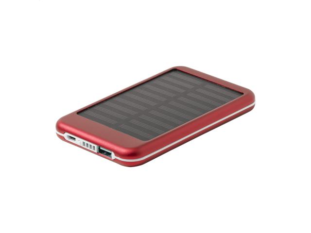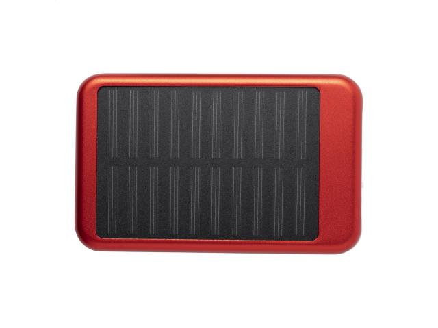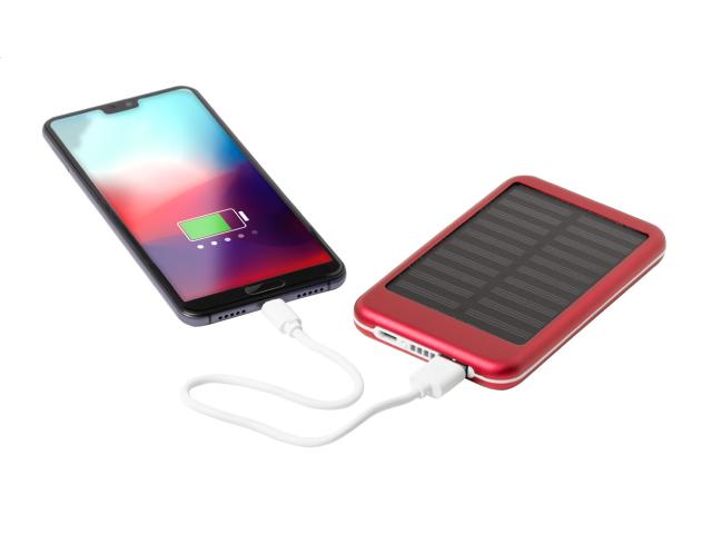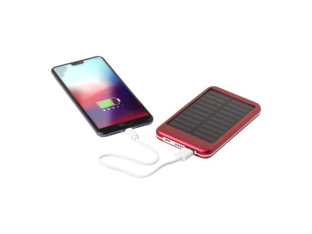 Aluminium USB power bank with 4000 mAh battery and built-in solar charger. Including micro USB charger cable.