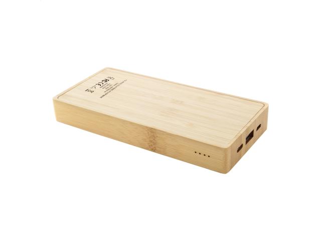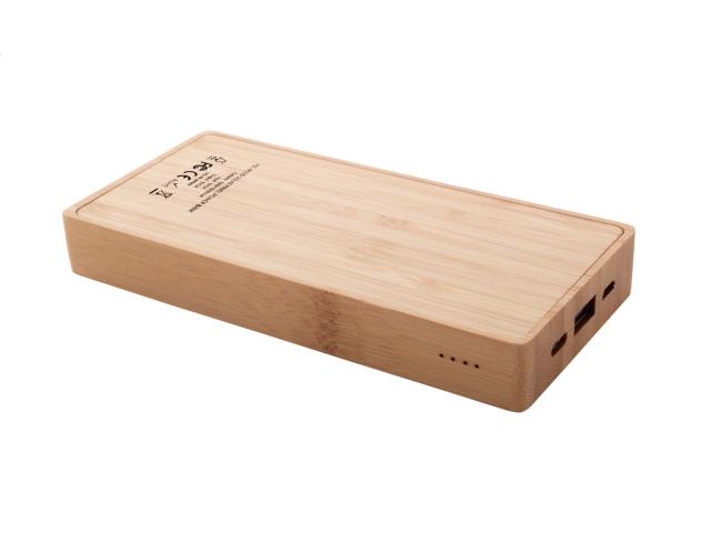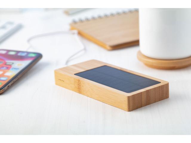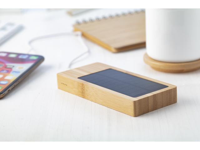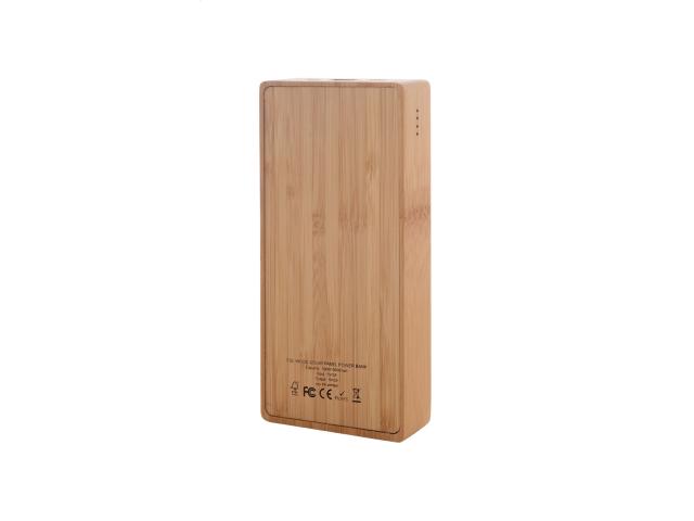 Bamboo USB power bank with 8000 mAh battery and built-in solar charger. The power bank can be charged through USB-C and micro USB ports. Including USB charger cable.