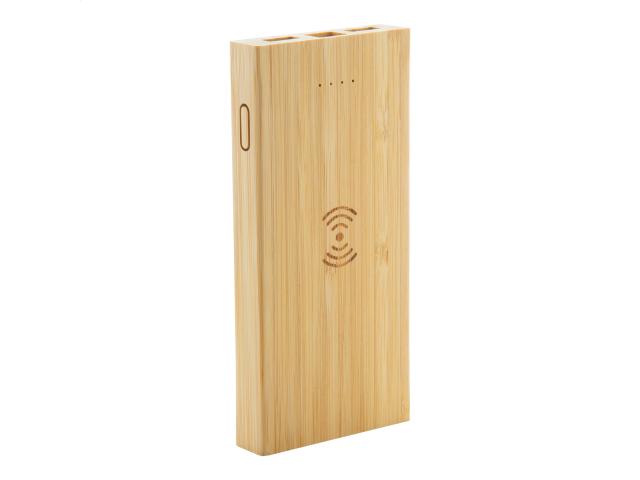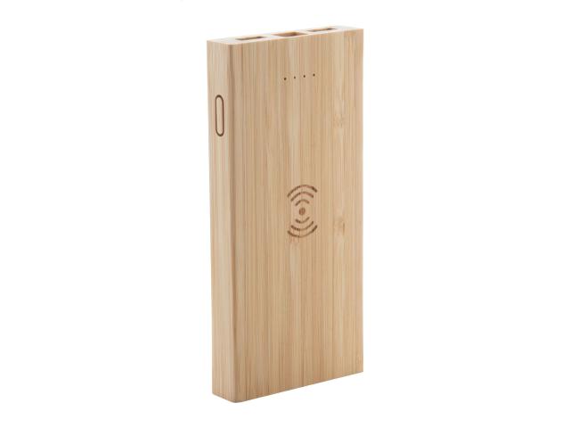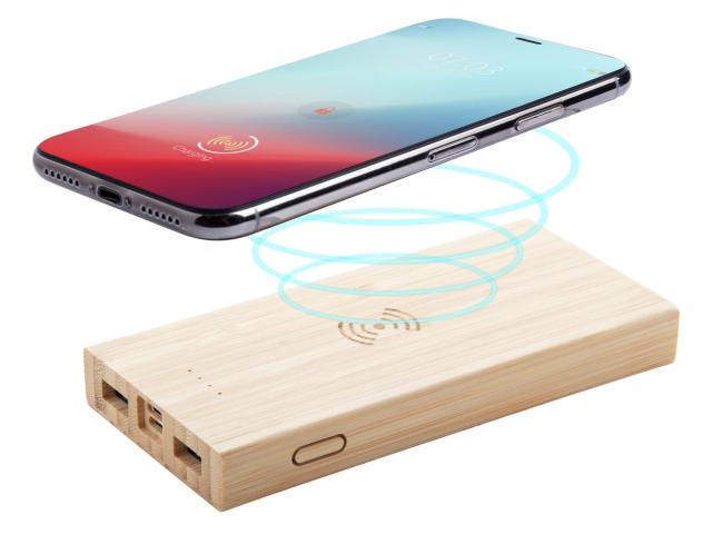 Bamboo USB power bank with built-in wireless charger (5W), 2 USB charger ports and 6000 mAh battery. Micro USB and USB-C input ports. Including USB charger cable.