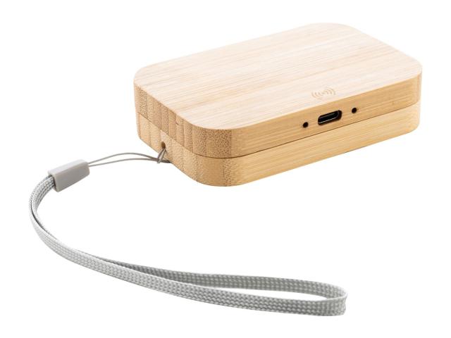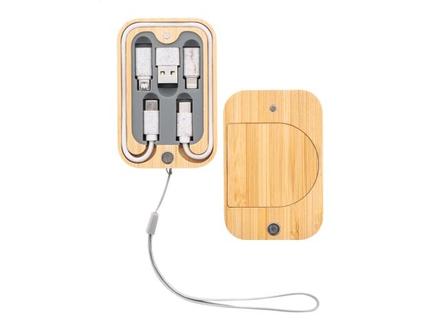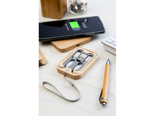 Ecological wheat straw plastic USB charger cable set and wireless fast charger (15W) in magnetic bamboo case with carry strap. Including USB-C cable with USB, micro USB and Lightning adaptors.
