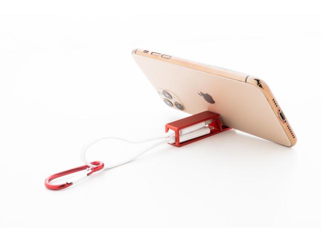 USB charger cable with recycled aluminium carabiner and mobile holder with bottle opener function. With micro USB, USB-C and Lightning connectors. With USB and USB-C inputs.