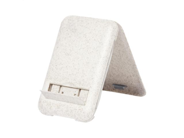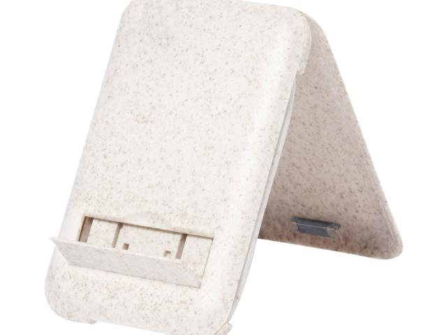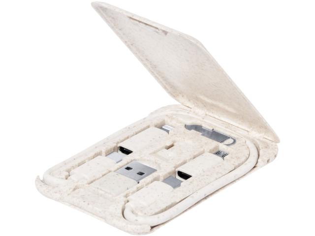 USB charger cable set in ecological wheat straw plastic case with mobile holder function. With SIM card ejector and micro USB, USB-C and Lightning connectors. With USB and USB-C inputs.