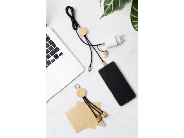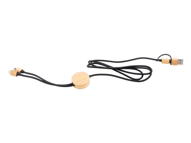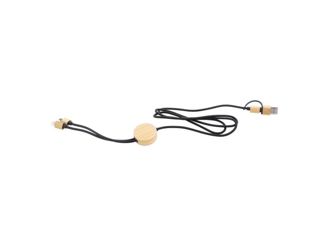 RPET and bamboo USB charger cable with micro USB, USB-C and Lightning connectors. With USB and USB-C inputs. Cable length: 100 cm.