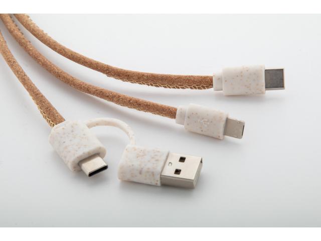 Natural cork and ecological wheat straw plastic charger cable with micro USB, USB-C and Lightning connectors. With USB and USB-C inputs.