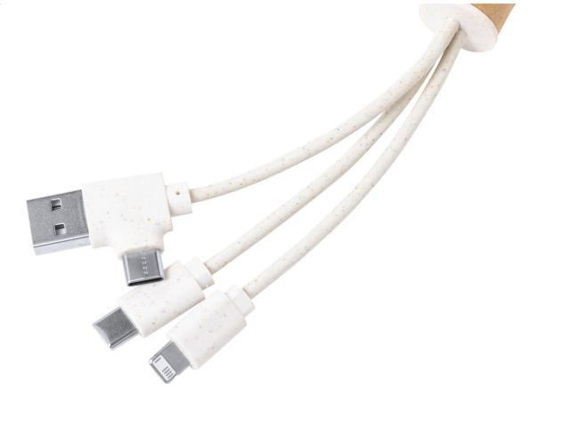 Keyring USB charger cable in recycled paper and wheat straw plastic with micro USB, USB-C and Lightning connectors. With USB and USB-C inputs.