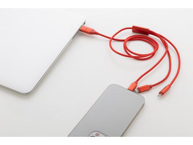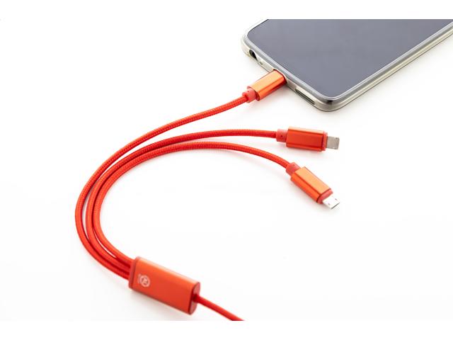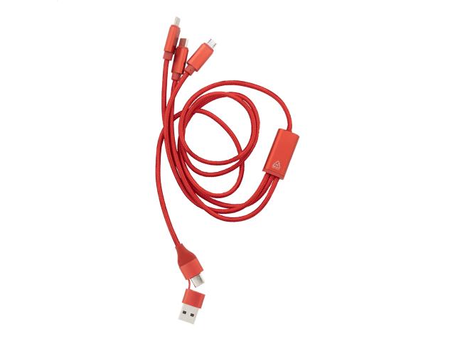 Recycled aluminium and RPET USB charger cable with micro USB, USB-C and Lightning connectors. With USB and USB-C inputs. Cable length: 100 cm.