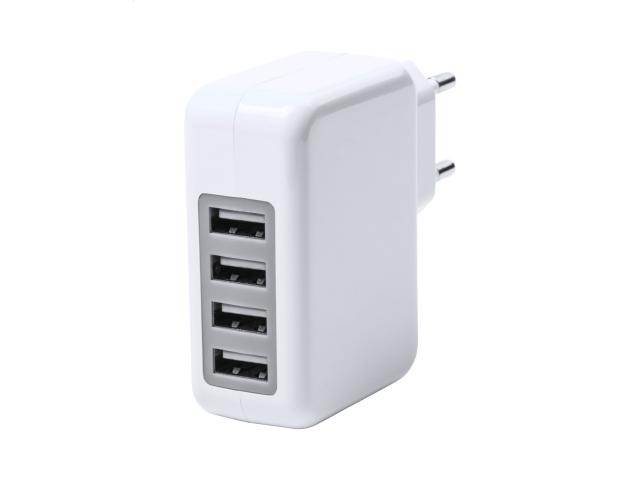 Plastic USB wall charger with 4 ports, max output 3100 mA.
