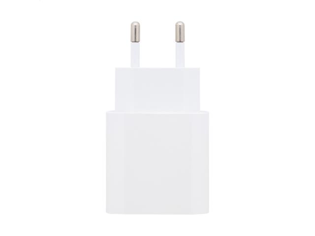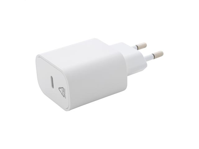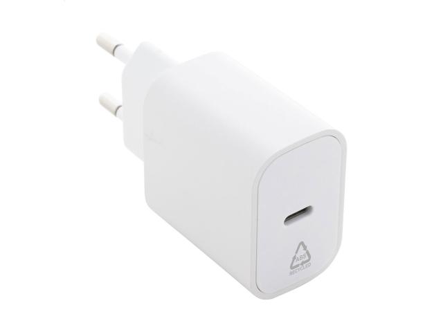 Recycled ABS fast-charging USB wall charger 1 USB-C port. Supports quick charging technology (PD20W / QC3.0). With 2-pole European plug.