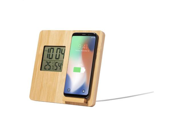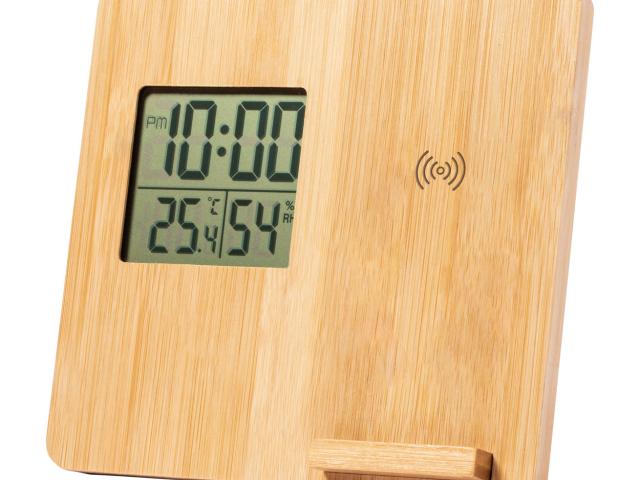 Bamboo weather station with phone holder and built-in wireless fast charger (10W). Functions: alarm clock, temperature and humidity. Including button cell battery and USB charger cable.