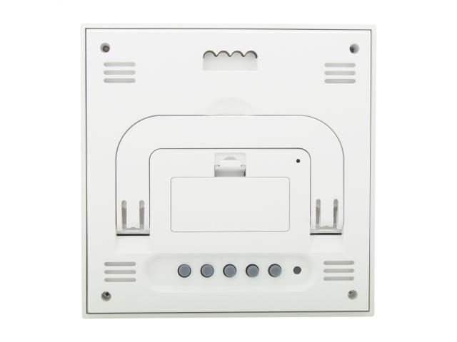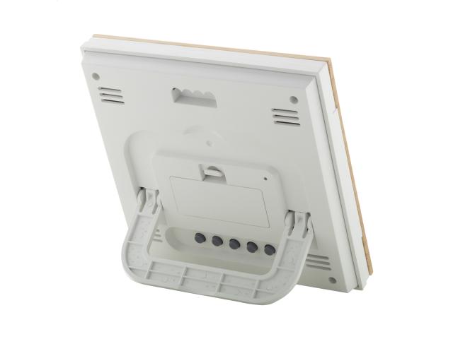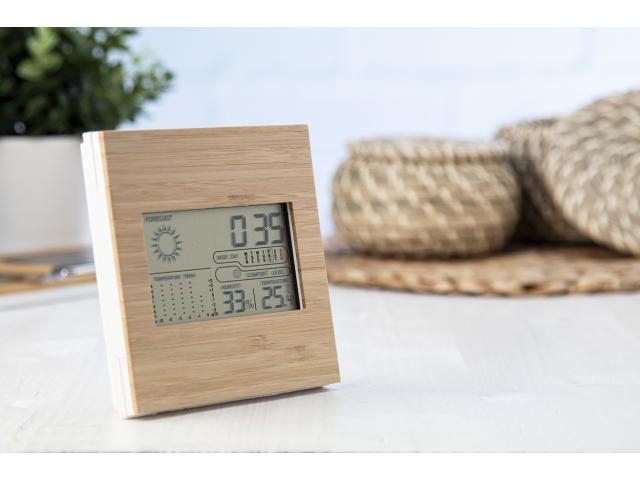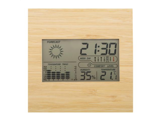 Weather station and digital clock with bamboo front panel. Functions: alarm clock, calendar, thermometer, humidity display and temperature trend memory. Operates with 2 AAA batteries, without battery.