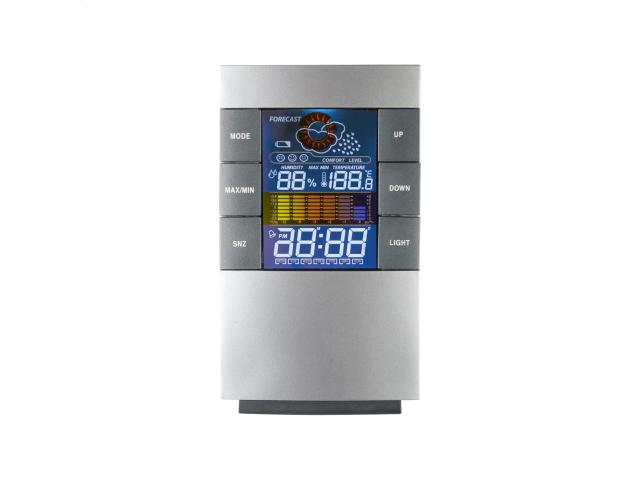 Digital clock and weather station with colour display. Functions: alarm clock, thermometer, humidity display and 12 hour temperature trend memory. Operates with 2 AAA batteries, without batteries.