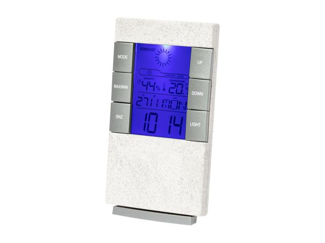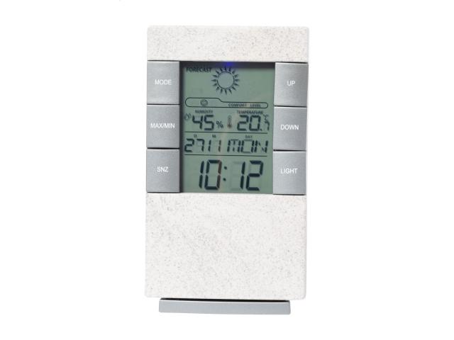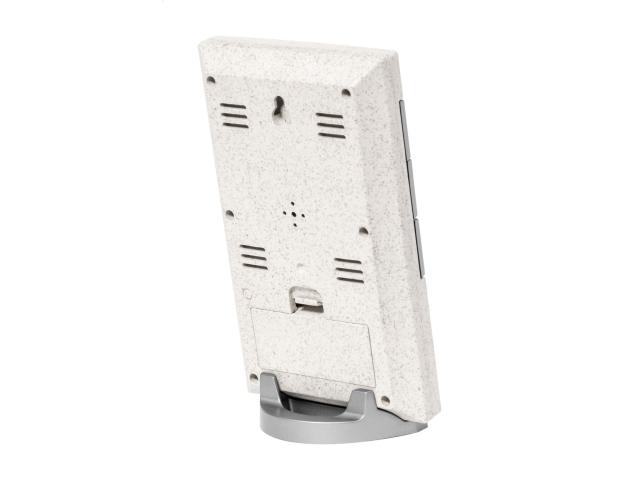 Ecological wheat straw plastic digital clock and weather station with thermometer and humidity display. Operates with 2 AAA batteries, without batteries.