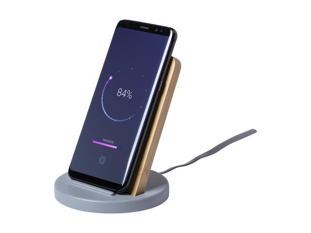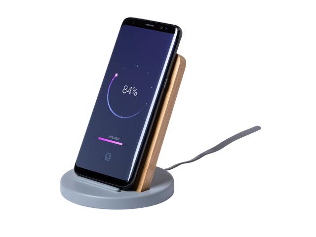 Limestone cement and bamboo desk mobile holder with built-in wireless charger (10W). Including matching colour USB charger cable.