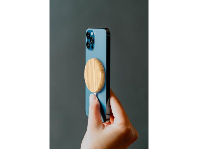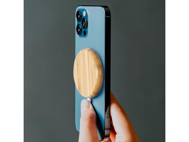 Magnetic wireless fast charger (10W) in bamboo housing with LED charging indicator light. Including self-adhesive metal ring to use the magnetic function on any wirelessly chargeable device. Including USB charger cable.
