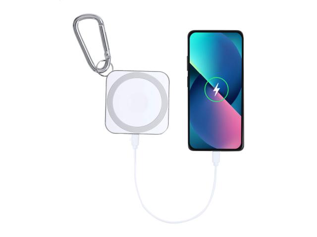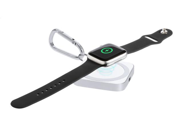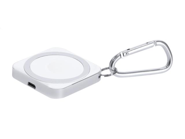 Magnetic wireless fast charger (15W) in aluminium housing with carabiner. Designed for charging smartphones, earphones and smartwatches. Compatible with iPhone® 12 or newer.