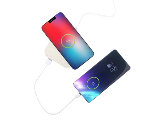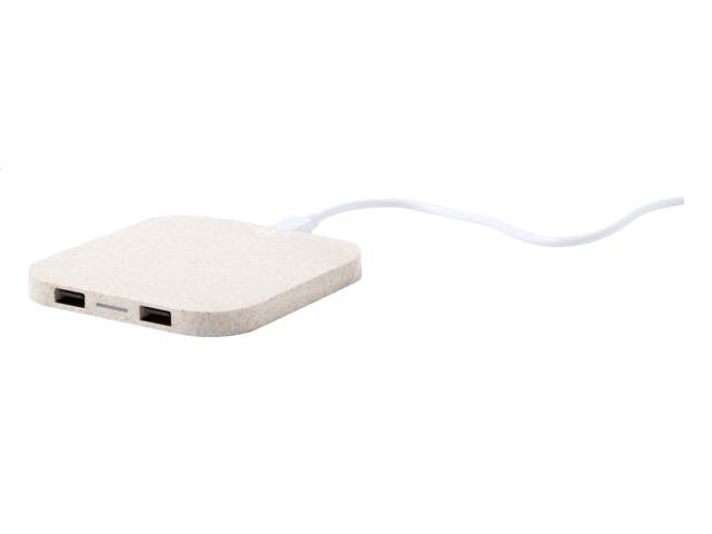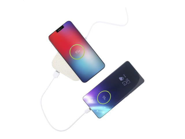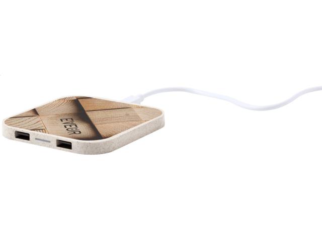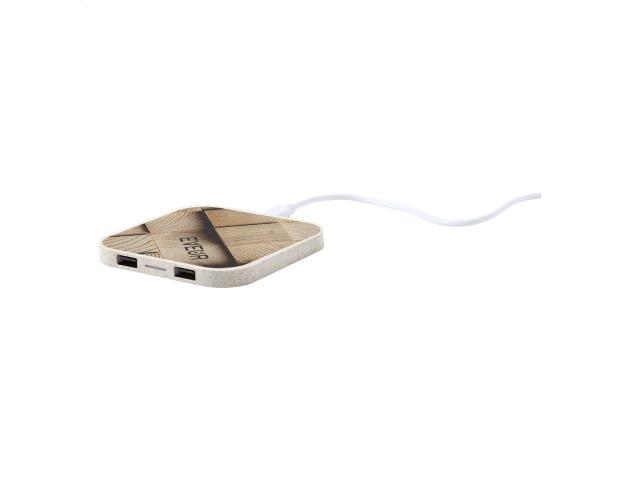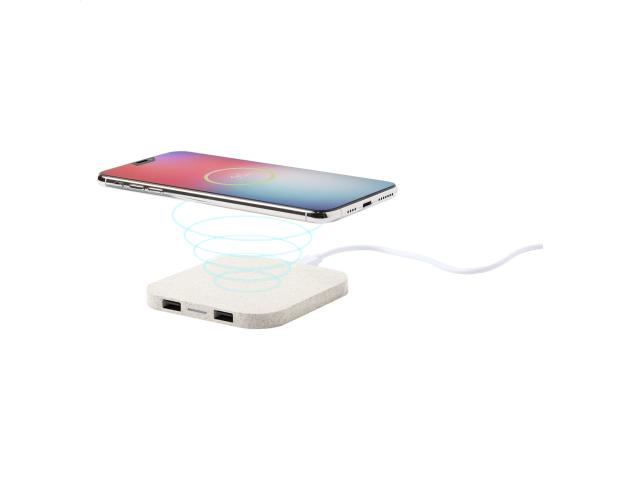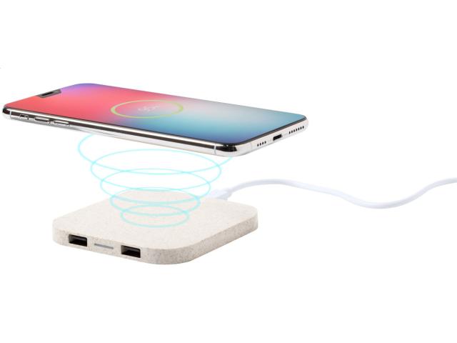 Wireless charger (10W) in ecological wheat straw plastic with 2 USB charger ports. Max output 2100 mA. Including USB charger cable.