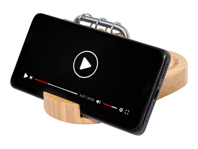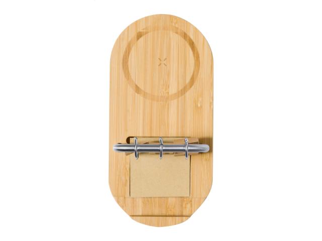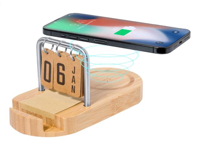 Bamboo, multifunctional wireless fast charger (15W) with mobile holder and perpetual calendar on metal frame. With USB and USB-C charger ports. Including 50 sheets kraft paper sticky notes and USB charger cable.