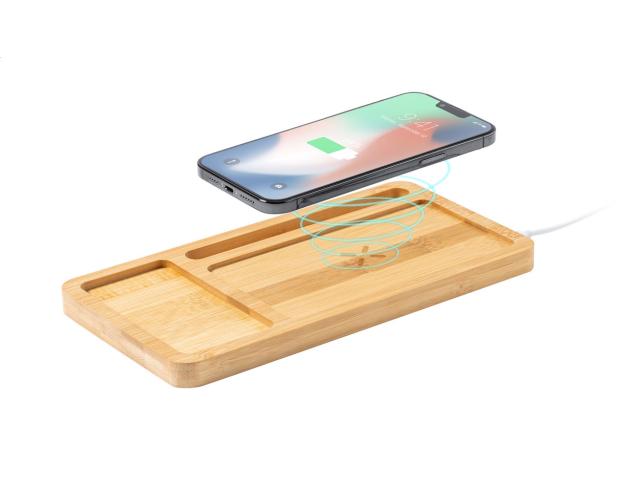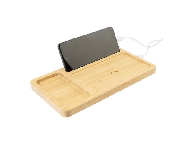 Bamboo desk organizer and mobile phone holder with built-in wireless fast charger (15W). With USB charger port for charging 2 devices simultaneously (1 wirelessly and 1 via cable). Max. output: 2000 mA. Including USB charger cable.