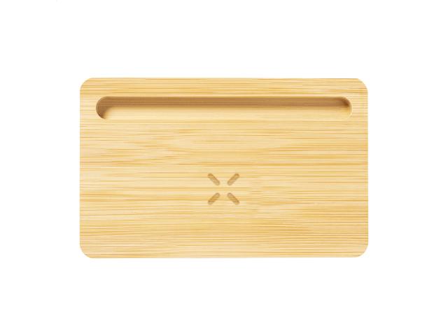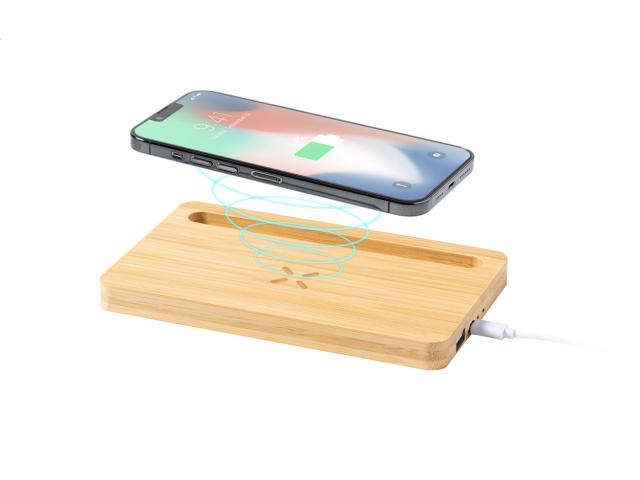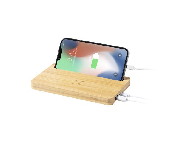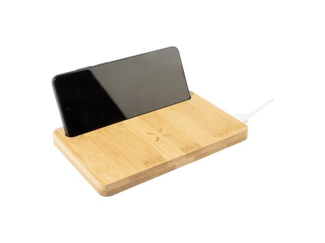Bamboo desk organizer and mobile phone holder with built-in wireless fast charger (15W). With USB charger port for charging 2 devices simultaneously (1 wirelessly and 1 via cable). Max. output: 2000 mA. Including USB charger cable.