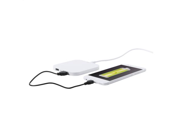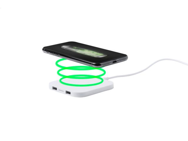 Plastic wireless charger (10W) with 2 USB charger ports. Max output 2100 mA. Including USB charger cable.
