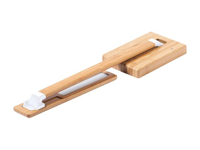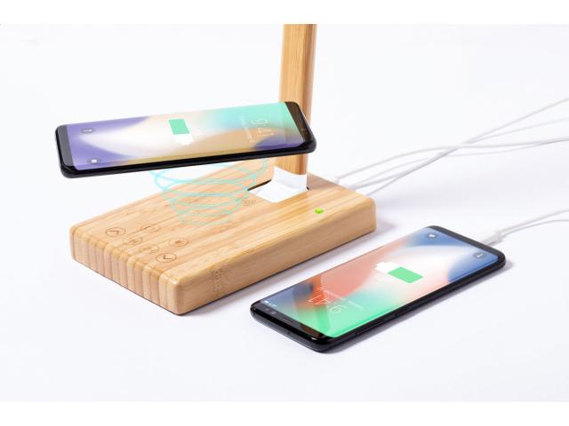 Bamboo multifunctional desk lamp with 25 LEDs, adjustable brightness and 1/2 hours timer. With built-in wireless fast charger (10W) and USB charger port for charging 2 devices simultaneously (1 wirelessly and 1 via cable). Including USB charger cable.