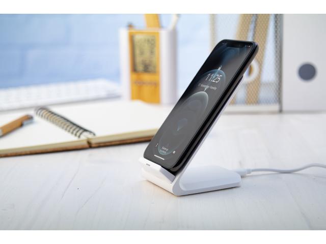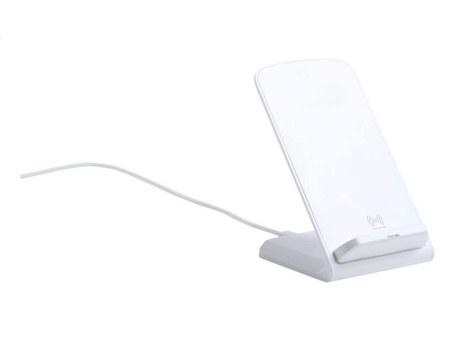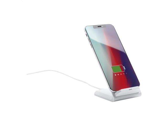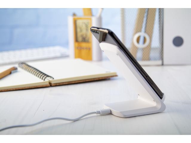 Plastic desk mobile holder with built-in wireless fast charger (10W). Including USB charger cable.
