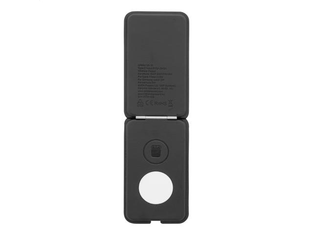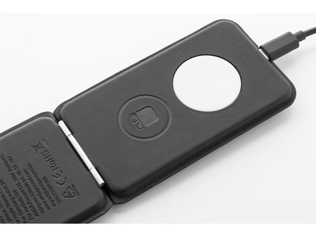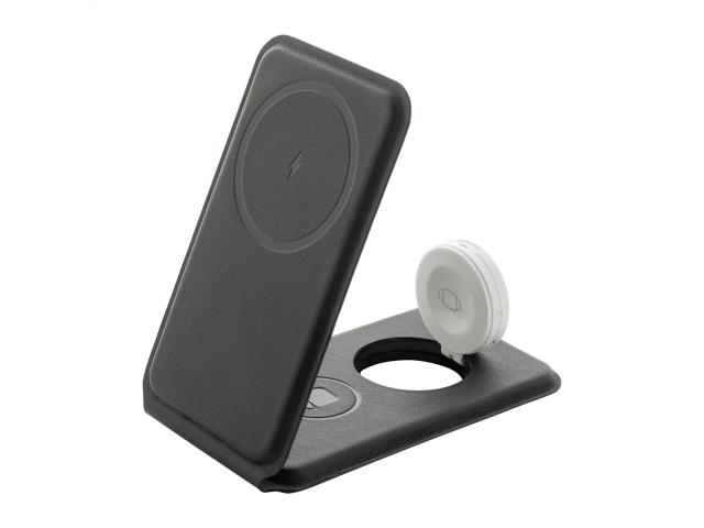 Luxury, foldable mobile phone holder and wireless charger set in recycled PU leather. With magnetic wireless fast charger (15W), wireless charger (5W) for earphones (Apple® only) and wireless charger (2,5W) for smart watches (Apple® and Samsung®). Including self-adhesive metal ring to use the magnetic function on any wirelessly chargeable device. Compatible with iPhone® 12 or newer. Including USB charger cable.