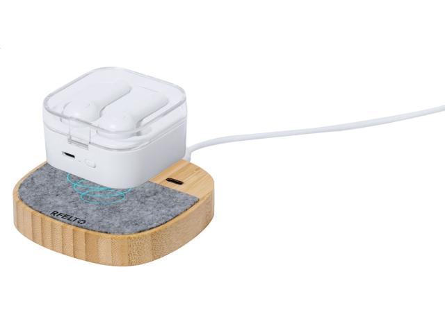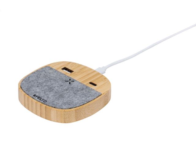Wireless fast charger (15W) in bamboo and RPET felt housing. With 1 USB and 1 USB-C charger port for simultaneous wired and wireless charging. Including USB charger cable.