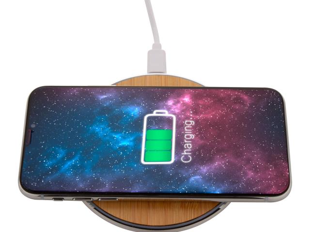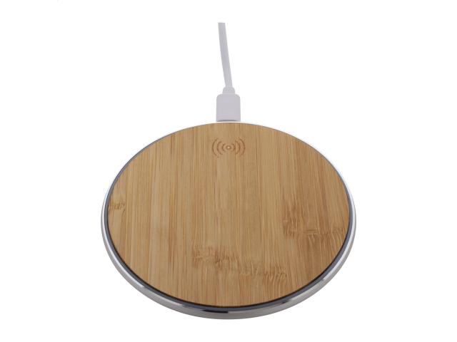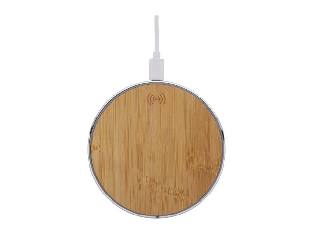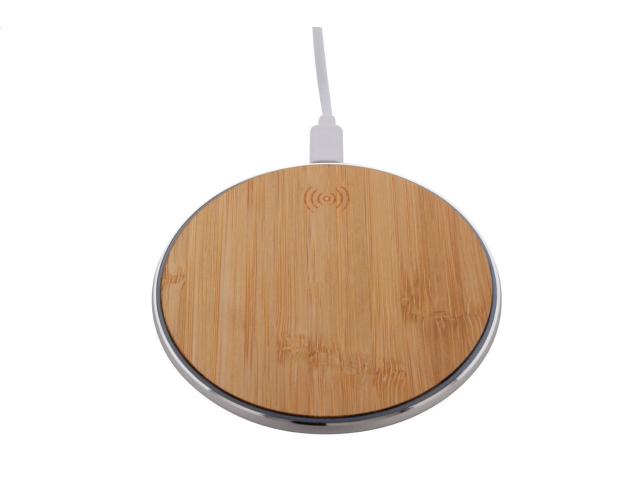 Wireless fast charger (15W) in recycled aluminium and bamboo housing. Including USB charger cable.