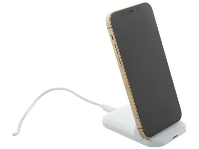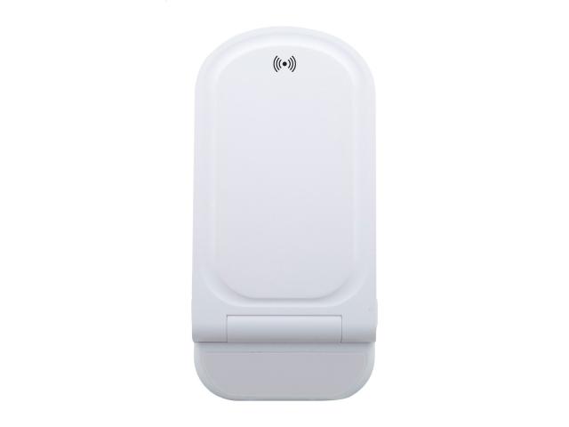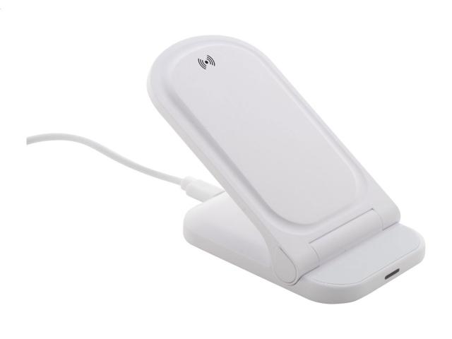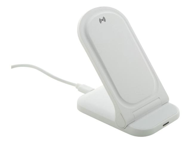 Foldable, adjustable desk mobile holder in recycled ABS plastic, with built-in wireless fast charger (15W). Including USB charger cable.