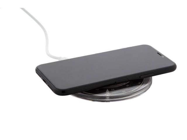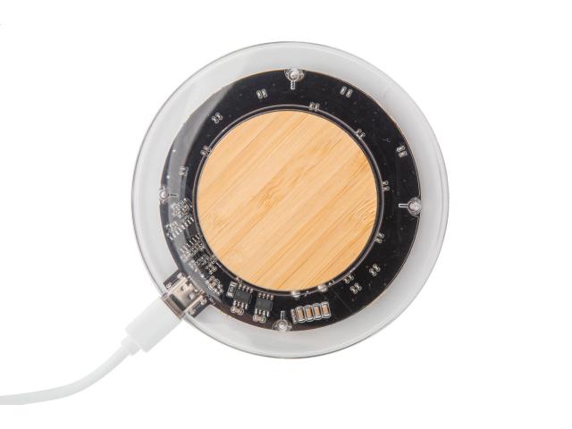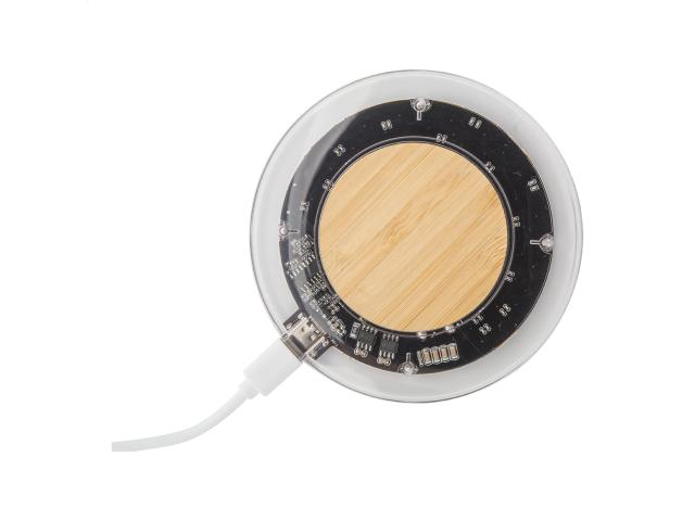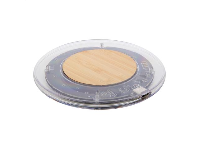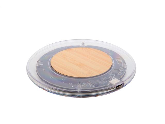 Wireless fast charger (15W) in transparent plastic and bamboo housing with visible electronic components. Including USB charger cable.