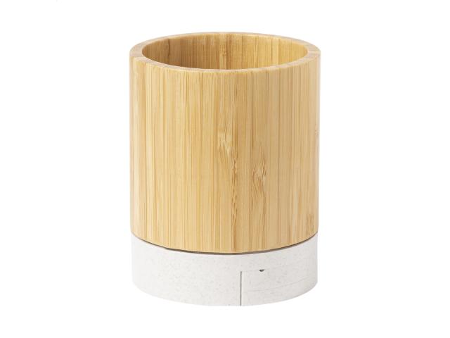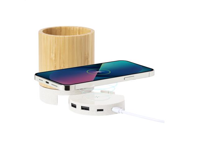Multifunctional pen holder in bamboo and ecological wheat straw plastic. With mobile phone holder, wireless charger (5W) and 3-port USB hub (2 USB and 1 USB-C ports, USB 2.0). Including USB charger cable.