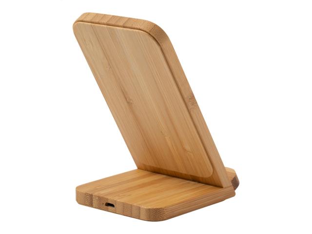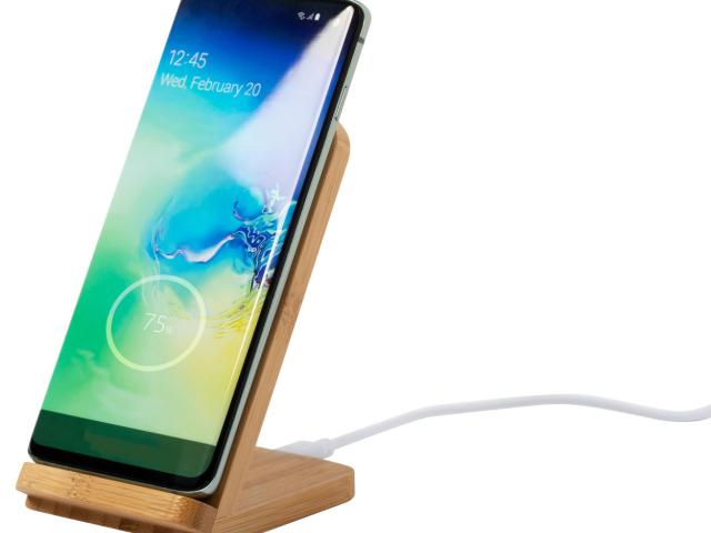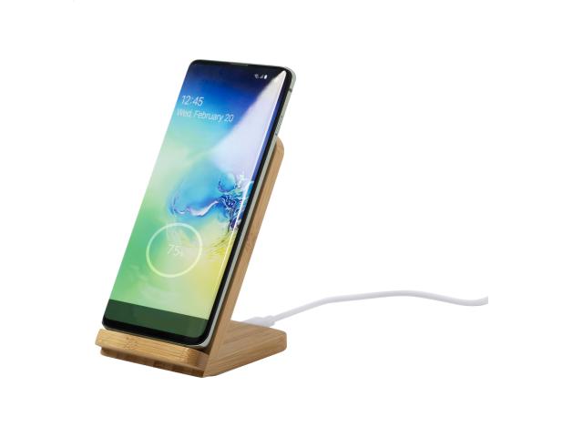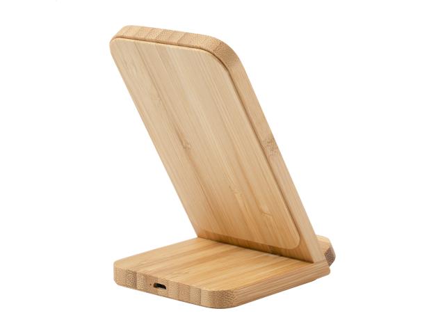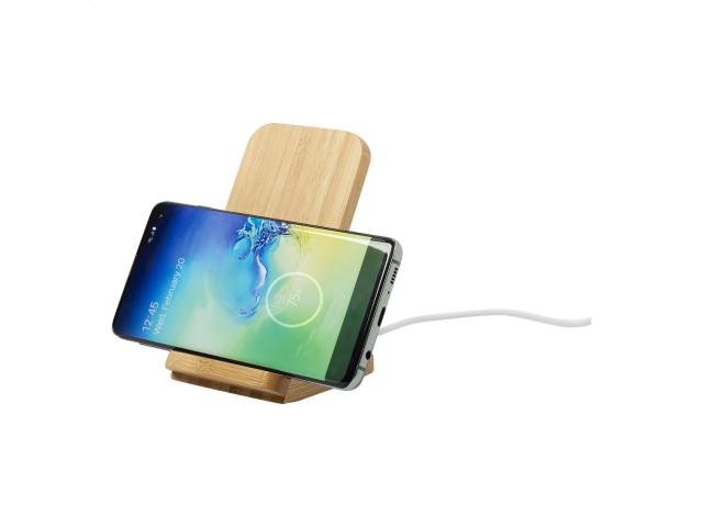 Bamboo desk mobile holder with built-in wireless charger (10W). Including USB charger cable.