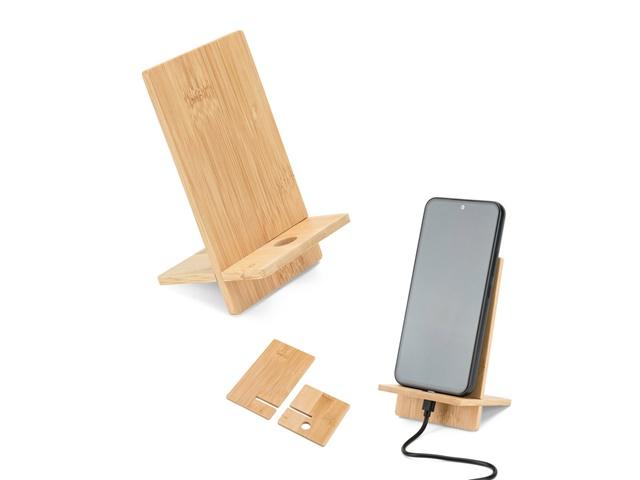 Držač za mobitel od bambusa, odvojiv na dva dijela. Sadrži rupu koja vam omogućuje punjenje mobilnog uređaja dok koristite držač. Isporučuje se u poklon kutiji od kraft papira. Budući da je proizvod izrađen od prirodnih materijala, boja te rezultat ispisa mogu se razlikovati od proizvoda do proizvoda. Sklopljene dimenzije: 80 x 130 x 80 mm | Kutija: 83 x 12 x 140 mm