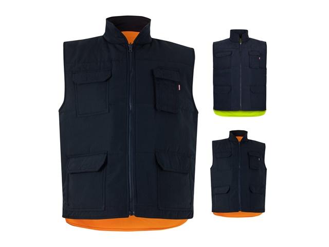 Kovrčava haljina (220g/m²), dvostruka i s više džepova, od poliestera (100%), s patentnim zatvaračem i dvostrukim potezačem. Preokretni dio ima reflektirajuće trake na torzu i otporne na vjetar trake na otvoru za ruke. Prsluk ima traku sa strane oko struka i šest džepova (2 džepa na prsima i 2 donja džepa). Proizvod u skladu s EU Reg. 2016/425, ovjeren prema EN20471 i klasa br. 1. Veličina: S, M, L, XL, 2XL, 3XL