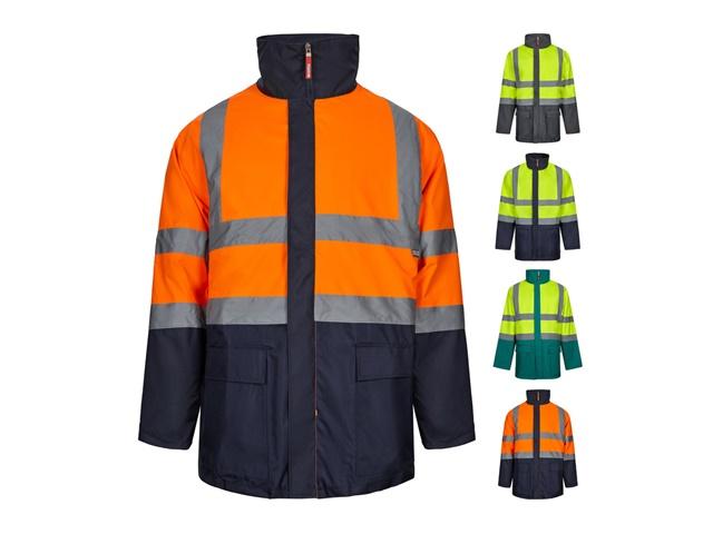 Dvobojna 4-u-1 parka (180g/m²), od poliestera (100%) s PU premazom. 4u1: parka, baloner, jakna i prsluk.Parka/kabanica: sa skrivenim središnjim patentnim zatvaračem s pojasom koji se zatvara na čičak, reflektirajućim prugama na torzu, ramenima i rukavima te skrivenom kapuljačom, sa dva donja džepa.Jakna/prsluk: sa središnjim patentnim zatvaračem, reflektirajućim prugama na torzu i ramenima, rebrastim manžetama i odvojivim rukavima. S tri džepa (2 donja džepa i 1 unutarnji džep). Proizvod u skladu s EU Reg. 2016/425, ovjeren prema EN20471 i klasa br. 2. Veličina: S, M, L, XL, 2XL, 3XL