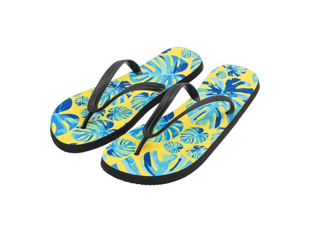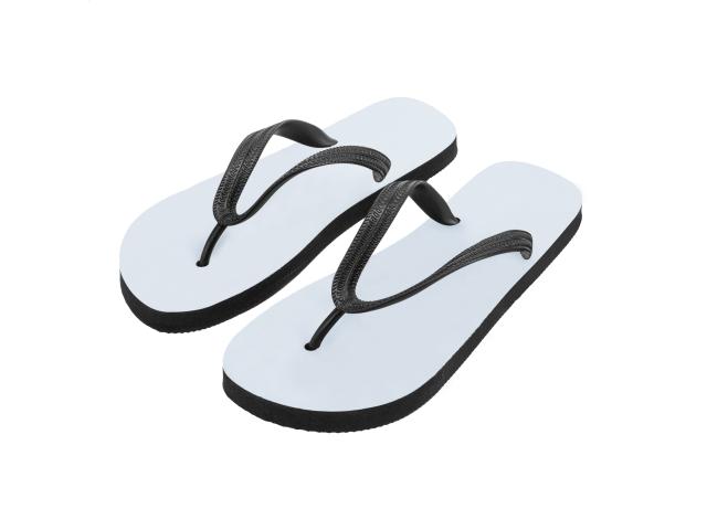 Unisex, sublimation beach slippers with black PVC straps. Price includes sublimation printing. MOQ: 50 pcs.
