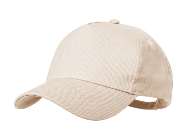 Organic cotton baseball cap with 5 panels and metal buckle closure.