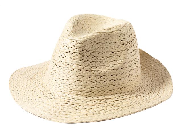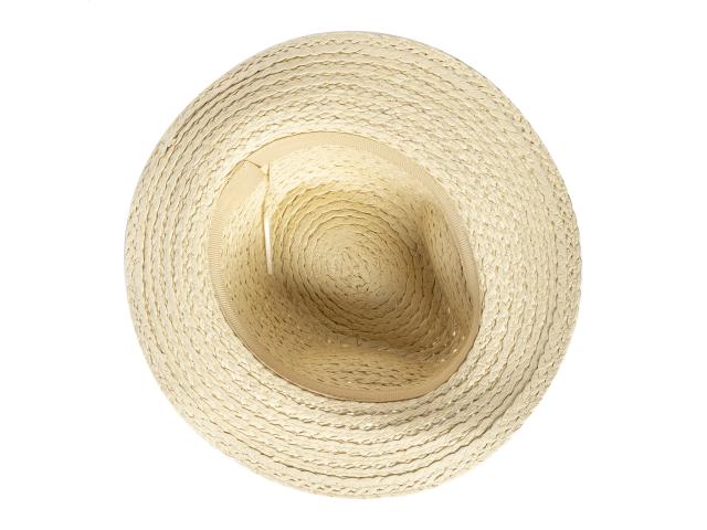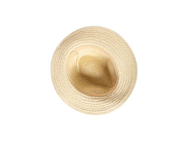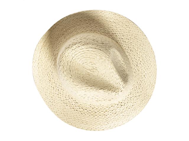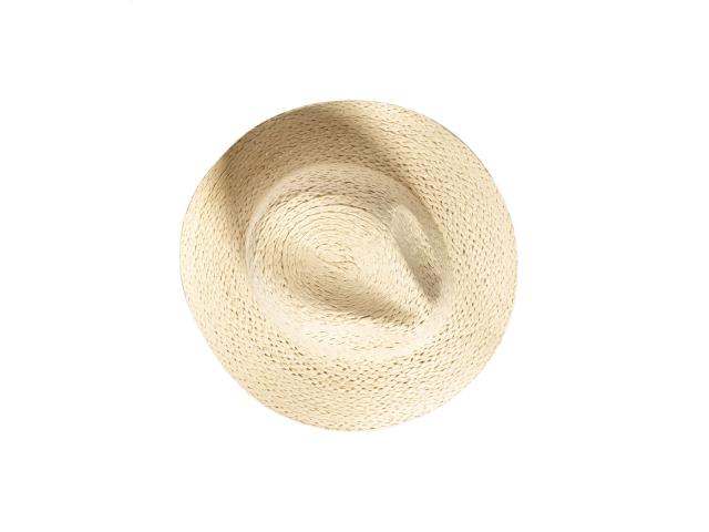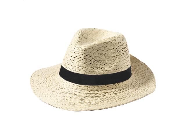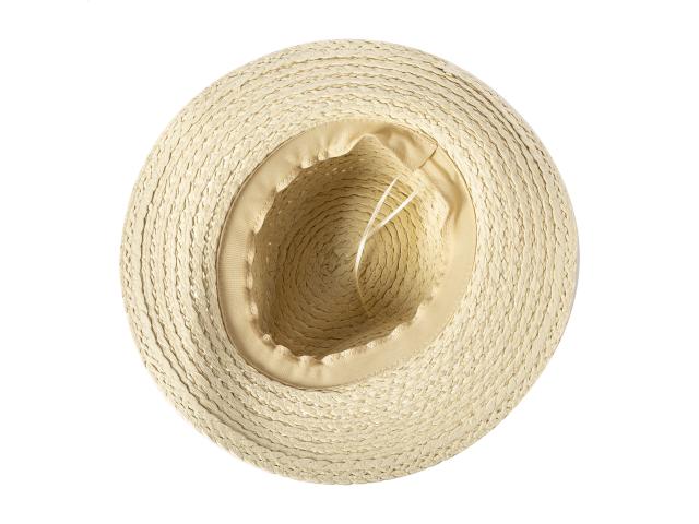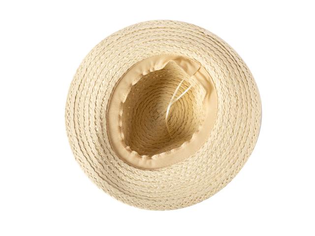 Unisex straw hat in synthetic fibre with adjustable inside band. This hat is not directly printable; customization is available with our custom sublimation-printed hat ribbons (AP718139 / AP718367).