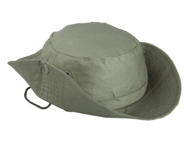 100% cotton safari hat with chin band and metal fastener.