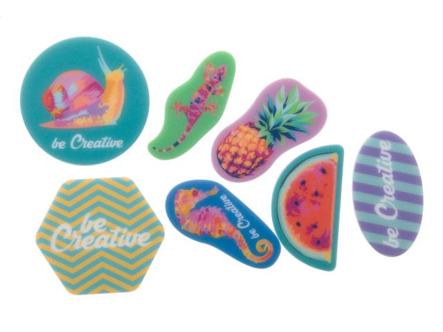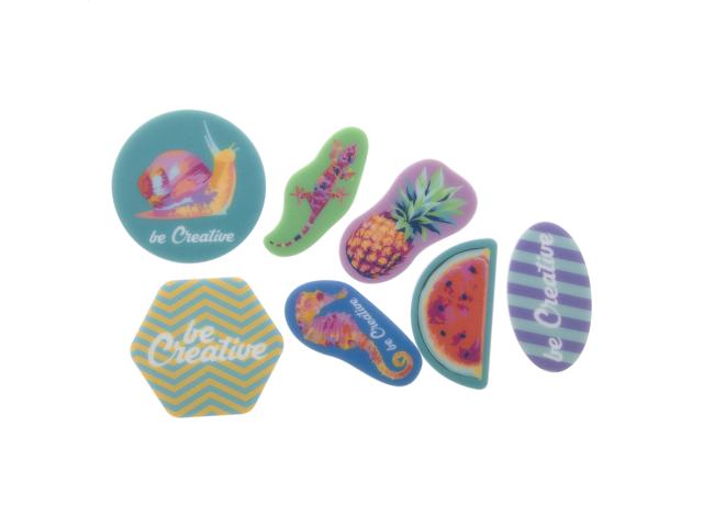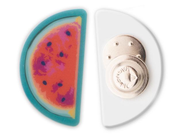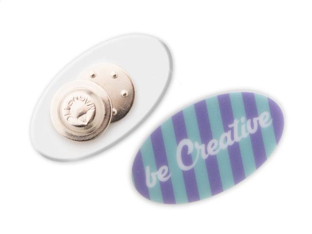 Custom made plastic badge with magnetic pin and full colour printing. Produced in custom shape – maximum size: 50×50 mm. Price includes UV LED printing. MOQ: 100 pcs.