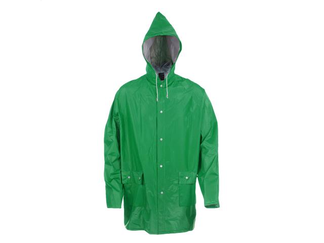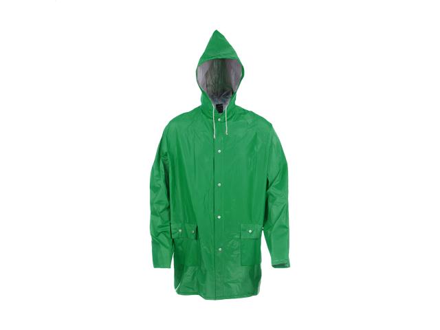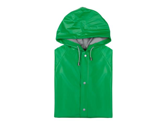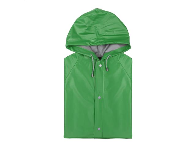 Hooded raincoat in resistant PVC with heat-sealed finish. With button closure and 2 front pockets.