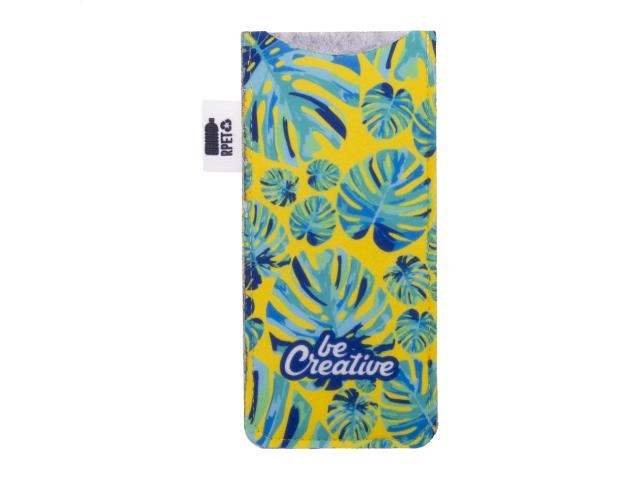 Custom RPET felt sunglasses case with full colour printed front side. With distinctive RPET label. Price includes sublimation printing. MOQ: 50 pcs.