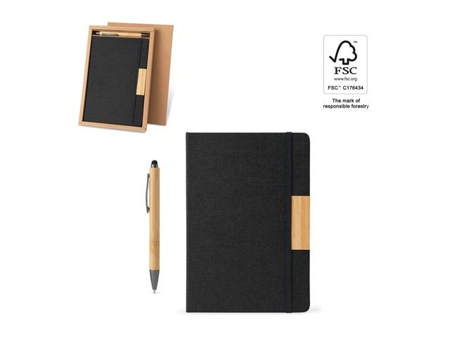 Set koji se sastoji od bilježnice A5 tvrdog uveza i kemijske olovke. Bilježnica od recikliranog poliestera (100% rPET) ima 160 crtanih stranica na papiru boje bjelokosti izrađenom od FSC™ certificiranih i drugih kontroliranih materijala, vrpcu i elastičnu traku za zatvaranje bilježnice. Navlaka uključuje pravokutni detalj od bambusa. Bambusova kemijska olovka ima crnu tintu. Isporučuje se u poklon kutiji od kraft papira, izrađenoj od FSC™ certificiranog materijala i drugih kontroliranih materijala. Budući da je proizvod izrađen od prirodnih materijala, boja te rezultat ispisa mogu se razlikovati od proizvoda do proizvoda